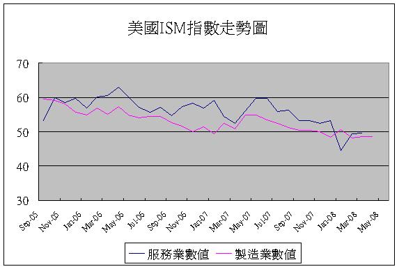 2.製造業指數自2008年2月份跌落於50以下,但服業指數卻早於2008年1月就跌破50。美國ISM服業業指數若能攀上50以上,相信應該可以給市場帶來不少的信心。