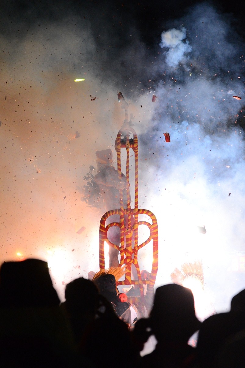 所以人群慢慢的散開,原本正煩惱著擠不進去的我,突然就發現,我已經站在舞台前第一排的搖滾區了,與演唱會不同的是,在我耳邊大聲播放的不是蹦滋蹦滋的搖滾樂,而是霹靂啪啦的鞭炮響,眼前的煙霧不是乾冰,而是濃濃煙硝的鞭炮味,十分難聞,所以耳塞跟口罩是非常重要的!!