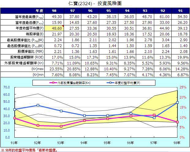 2.但以目前之收盤價而言,其Kn(%)值處中等水準。若調整其本益比為2009年整年度EPS估算,則約11.5倍左右,則其Kn(%)值應可提高至約8.70%左右,投資風險溢酬仍不算太差。