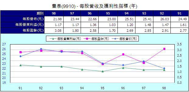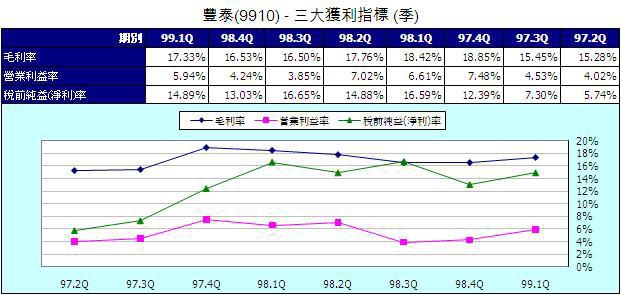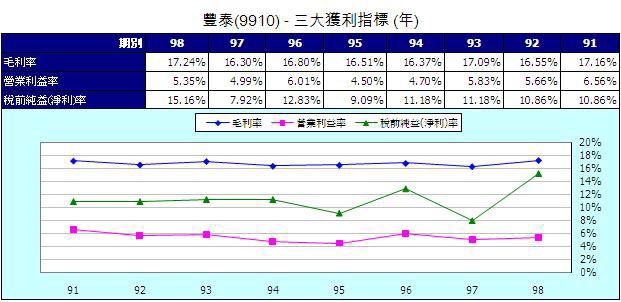 1.以年度而言,代表本業獲利能力之毛利率及營業利益率長年維持平穩,稅前純益率則受海外廠投資收益消長影響,在98年明顯攀抵高峰,獲利能力明顯轉強。