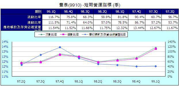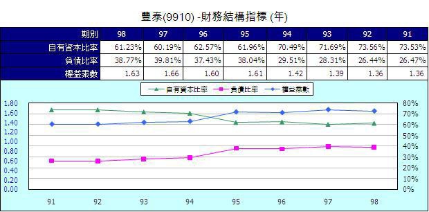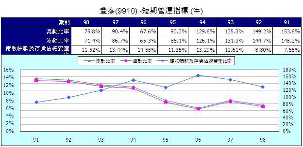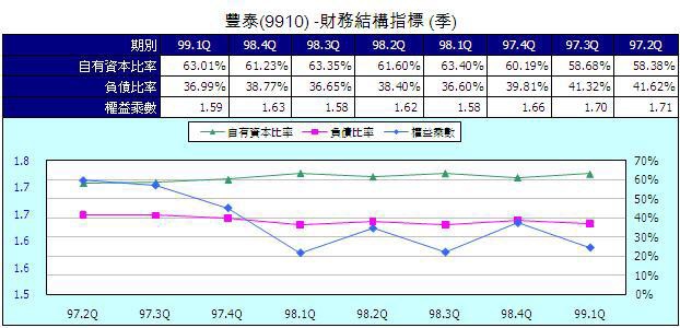 2010年Q1之自有資本比率63.01%,顯示該公司財務結構尚稱穩健。2006年度以後之流動比率與速動比率,則震盪走低,2010年Q1則已明顯改善。整體財務狀況尚稱平穩。