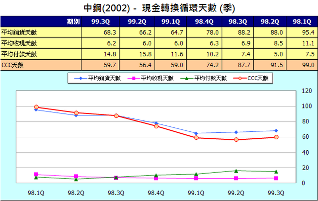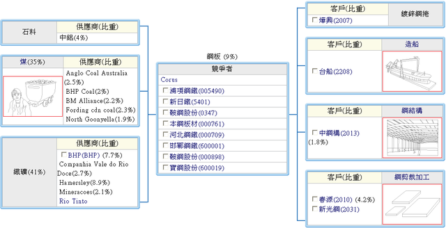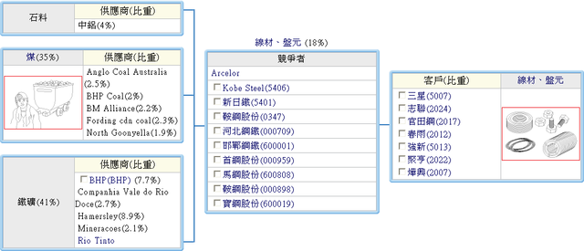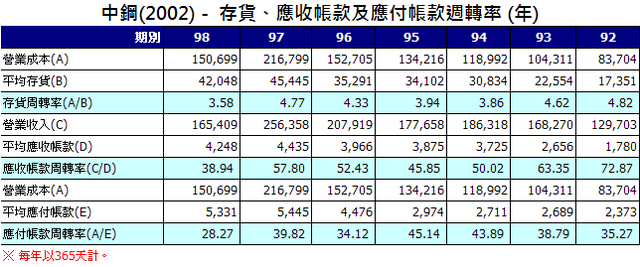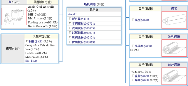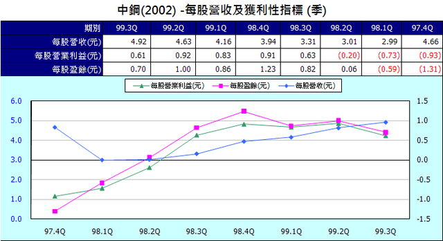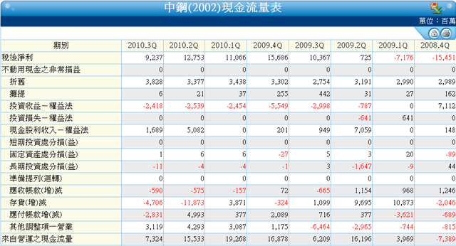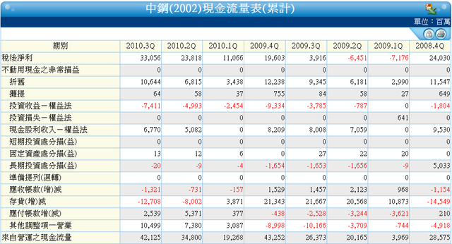 中鋼(2002) 《財務結構分析》 《盈餘指標》 《ROE細部邏輯分析》 《現金流量表分析》 《營運週轉天數(CCC)分析》 《投資風險圖》 《營業利益與稅後淨利》 精實新聞 2010-11-17 09:01:01 記者 林詩茵 報導 在全球搶原料風潮下,兩岸鋼鐵龍頭大廠中鋼(2002)與寶鋼將攜手投資海外礦廠,尤其是鐵礦砂為主,以提高原料掌握度。