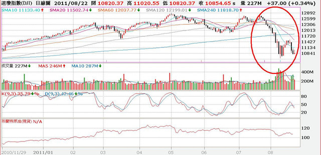 道瓊斯指數過去四周已經下跌14.7%,2009年3月以來最大的連續跌幅,距離今年4月高位下跌16%。上周5個交易日中周四股市最為波動,市場擔憂歐洲銀行主權債務危機有再度融資需要,加上經濟數據遜於,道指收跌400多點。