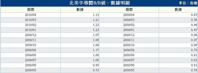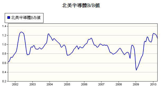 「國際半導體設備材料協會(SEMI)20日公佈,2010年4月北美半導體設備製造商接單出貨比(Book-to-Bill ratio)初估為1.13,低於前月的1.21(原為1.19)。1.13意味著當月每出貨100美元的產品就會接獲價值113美元的新訂單。上述數據象徵著北美半導體設備製造商BB值已經連續10個月高於1.0。