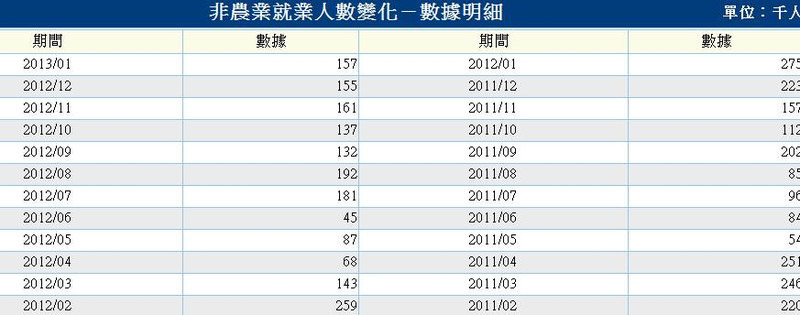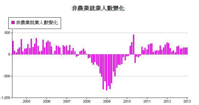 精實新聞 2013-02-01 23:10:42 記者 陳瑞哲 報導 美國一月份非農就業成長增速放緩,但之前兩個月的就業人數大幅上修,顯示美國經濟儘管在第四季雖然意外呈現萎縮,但景氣朝復甦前進的方向並未改變。 美國勞工部二月一日公佈,經過季節性因素修正後,2013年一月份非農業就業人數較前月增加15.7萬人,其中民間新增就業16.6萬人,政府部門減少0.9萬人;失業率由7.8%上揚至7.9%。根據彭博社的調查,經濟學家原預估非農業就業人數將月增16.5萬人,失業率為7.8%。 另外,2012年十一月、十二月份的非農業就業人數分別由原先的15.5萬人、16.1萬人上修至19.6萬人與24.7萬人。總結2012年,美國非農就業人數平均月增18.1萬人,優於2011年的15.3萬人。據路透社報導,經濟學家認為,美國就業市場若想回到可自食其力的水準,其每月平均新增就業人口必須達到25萬人。 詳細數據顯示,民間勞動參與率、就業人口比率分別持平於63.6%與59.6%;長期失業人口(至少27週)為470萬人,低與前月的480萬人,佔總失業人口的比例達38.1%。平均失業週數自前月的38.1週下降至35.3週(去年同期為38.2週)。 彭博社報導指出,美國在上次經濟衰退中共減少了874萬個就業機會,而截至一月止已復原了551萬個就業機會。 一月份產品生產部門就業人數月增3.6萬人,其中製造業月增0.4萬人,營建業月增2.8萬人,礦業與伐木業月增0.4萬人;服務業部門月增13萬人,其中教育與醫療業月增2.5萬人,專業商業服務人員月增2.5萬人,金融業月增0.6萬,零售業則月增3.3萬人,資訊業月增0.9萬人,運輸與倉儲業月減1.4萬人。 一月民間非農業部門平均每小時工資增加0.04美分至23.78美元;每週平均工時與前月持平同為34.4小時,其中製造業員工平均每週工時時減少0.1小時至40.6小時,平均加班時數持平於3.3小時。 嘉實XQ全球贏家報價系統顯示,截至台北時間四日晚間11時00分,道瓊工業平均指數漲0.91%;NASDAQ指數漲0.79%;標準普爾五百指數漲0.81%。