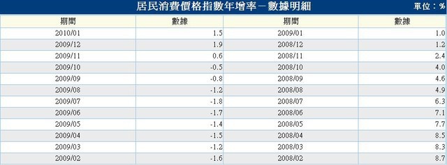 中國最新2010年1月消費者物價指數年增率為1.5%,連續第3個月轉為正數,但較上個月小幅下降。2010年2月開始,將進入低基期階段,消費者物價指數將可能明顯攀高。因此,中國人民銀行極可能在2010年第一季末,或第二季初,即進入升息循環。而升息對股、房市的殺傷力,則要視消費者物價指數上漲的幅度而定,物價漲越快越猛,人民銀行就可能加速升息,進入密集升息階段,就是股價指數的高風險區。