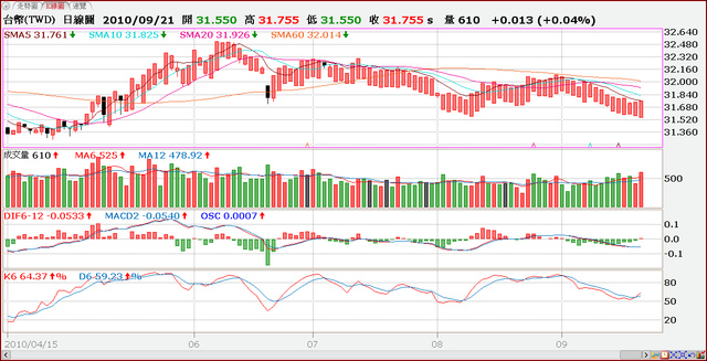 受人民幣升勢影響,台幣匯率自8月底的32.09元,升值至周二最低點的31.55元,終場在央行干預下,以31.755元收盤,總計本月至今,台幣匯率升值幅度為1.04%。央行干預台幣匯率對等釋出之新台幣,將透過外匯市場進入國內銀行體系或資本市場;外資於9月初至周二(9/21)為止,共計買超台股達630億,一反8月份賣超462億的情況。這也是造成台股9月以來漲幅達7.62%之主因。