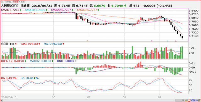 受日圓匯率創下最近15年新高牽引,加上美國11/2將舉行期中選舉,上自總統歐巴馬、財長蓋特納,下至國會議員,莫不齊聲拉高分貝,要求人民幣應更大幅度升值,以試圖平息美、中貿易逆差背後的高失業問題。姑不論人民幣匯率低估是否為造成美國高失業率的原因之一,但人民幣匯率已自8月底的6.8079元,升值至本周二的6.6979元,升幅達1.615%,看起來幅度不大,但已是連續第9個交易日走升,創人民幣兌美元自2005年7月重估以來最長一波升勢。
