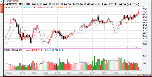 台積電上周最高價70元,若還原歷年權息後,股價已創歷史新高,以周三收盤價68元,預估其2010年本益比仍僅約10.5倍。張忠謀董事長指出,整體來看2010年,半導體產業快速成長30%,晶圓代工則成長4成,預估2011年半導體產業將持續成長5%,輕晶圓廠成長7%,晶圓代工則將成長14%,而台積電明年成長率則高於14%。由此觀之,台積電股價終將反應成長性,持續緩步向上修正。